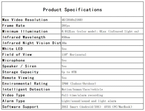 | Software-Unterstützung | ZOSI Smart (Android/IOS) AVSS (PC/MacBook) |
