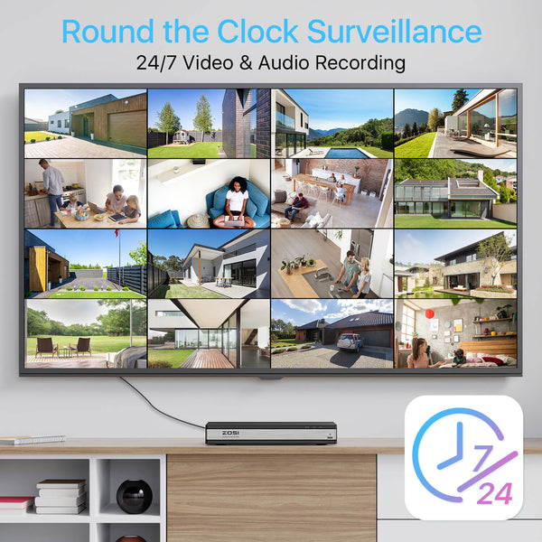 • Fernzugriff & Wiedergabe: Behalten Sie mit der kostenlosen Zosi Smart App Ihr Zuhause oder Ihr Unternehmen jederzeit und überall im Blick. Verwenden Sie Ihr Smart-Gerät (iOS oder Android), um Live-Feeds und Wiedergaben über WiFi- oder 3G/4G-Verbindungen anzuzeigen.