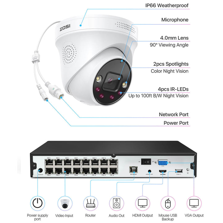 • Fernzugriff & Wiedergabe: Behalten Sie mit der kostenlosen Zosi Smart App Ihr Zuhause oder Ihr Unternehmen jederzeit und überall im Blick. Verwenden Sie Ihr Smart-Gerät (iOS oder Android), um Live-Feeds und Wiedergaben über WiFi- oder 3G/4G-Verbindungen anzuzeigen.