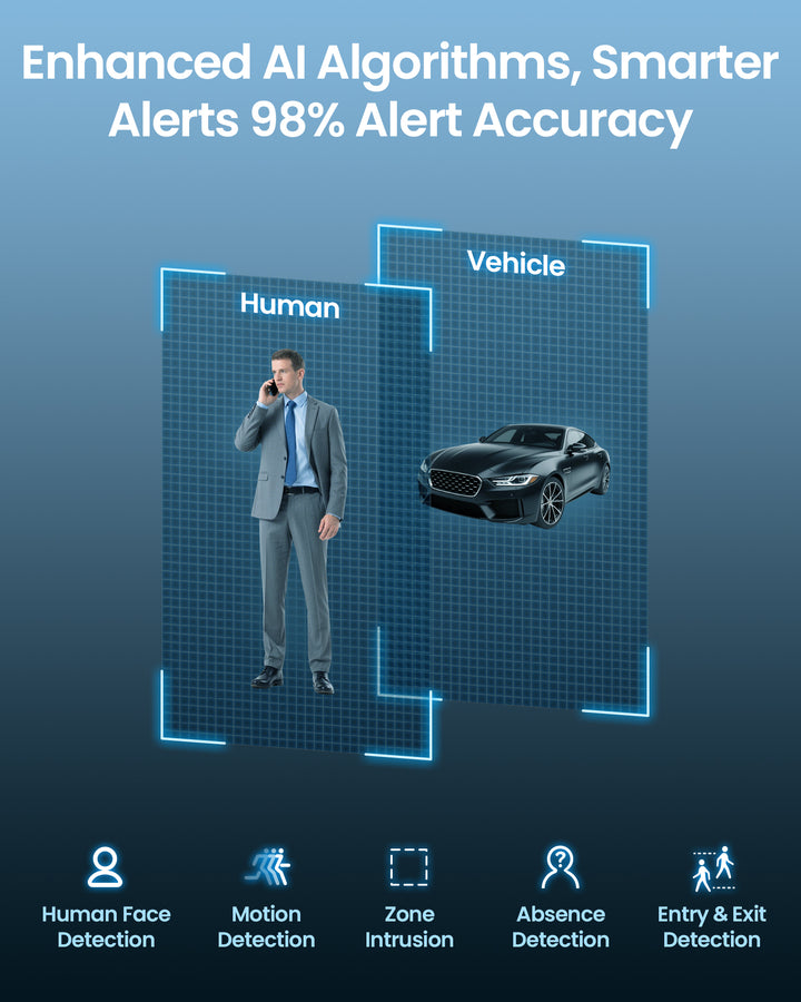 • Personen-/Fahrzeugerkennung: Diese Kamera verfügt über modernste KI-Erkennung und erkennt Personen und Fahrzeuge präzise. Passen Sie Warnzonen an, um unnötige Benachrichtigungen zu minimieren. Bei Erkennung menschlicher Bewegungen aktiviert die Kamera akustische und visuelle Warnungen und benachrichtigt Sie umgehend über unsere App und E-Mail.